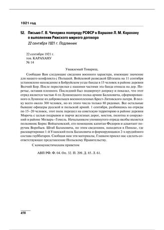 Письмо Г.В. Чичерина полпреду РСФСР в Варшаве Л.М. Карахану о выполнении Рижского мирного договора. 22 сентября 1921 г.