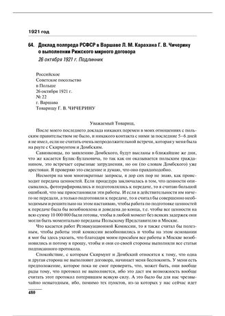 Доклад полпреда РСФСР в Варшаве Л.М. Карахана Г.В. Чичерину о выполнении Рижского мирного договора. 26 октября 1921 г.