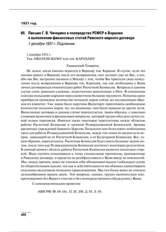 Письмо Г.В. Чичерина в полпредство РСФСР в Варшаве о выполнении финансовых статей Рижского мирного договора. 1 декабря 1921 г. // АВП РФ. Ф. 04. Оп. 32. П. 209. Д. 85. Л. 95.