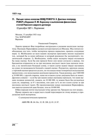 Письмо члена коллегии НКИД РСФСР Я.Х. Давтяна полпреду РСФСР в Варшаве Л.М. Карахану о выполнении финансовых статей Рижского мирного договора. 13 декабря 1921 г. // АВП РФ. Ф. 04. Оп. 32. П. 209. Д. 85. Л. 97.