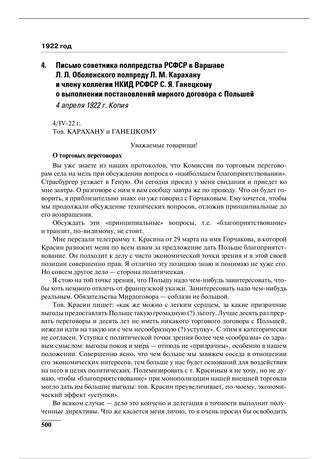 Письмо советника полпредства РСФСР в Варшаве Л.Л. Оболенского полпреду Л. М. Карахану и члену коллегии НКИД РСФСР С.Я. Ганецкому о выполнении постановлений мирного договора с Польшей. 4 апреля 1922 г.