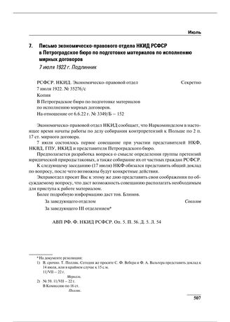Письмо экономическо-правового отдела НКИД РСФСР в Петроградское бюро по подготовке материалов по исполнению мирных договоров. 7 июля 1922 г. // АВП РФ. Ф. НКИД РСФСР. Оп. 5. П. 56. Д. 5. Л. 54.
