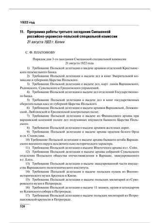 Программа работы третьего заседания Смешанной российско-украинско-польской специальной комиссии. 21 августа 1922 г.