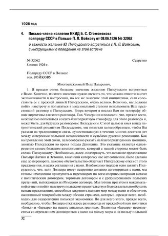 Письмо члена коллегии НКИД Б.С. Стомонякова полпреду СССР в Польше П.Л. Войкову от 08.06.1926 № 32062 о важности желания Ю. Пилсудского встретиться с П.Л. Войковым, с инструкциями о поведении на этой встрече