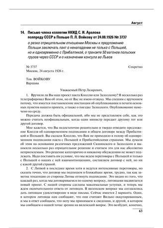 Письмо члена коллегии НКИД С.И. Аралова полпреду СССР в Польше П.Л. Войкову от 24.08.1926 № 3737 о резко отрицательном отношении Москвы к предложению Польши заключать пакт о ненападении не только с Польшей, но и одновременно с Прибалтикой, о транзите 50 вагонов польских грузов через СССР и о назначении консула во Львов // АВП. Ф. 04. Оп. 32. П. 219. Д. 52697. Л. 101–103.