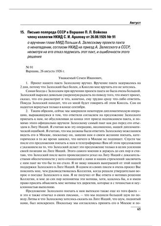 Письмо полпреда СССР в Варшаве П.Л. Войкова члену коллегии НКИД С.И. Аралову от 26.08.1926 № 91 о вручении главе МИД Польши А. Залесскому проекта пакта о ненападении, согласии НКИД на приезд А. Залесского в СССР, несмотря на его отказ подписать этот пакт, и ошибочности этого решения // АВП. Ф. 04. Оп. 32. П. 218. Д. 52691. Л. 23–28.