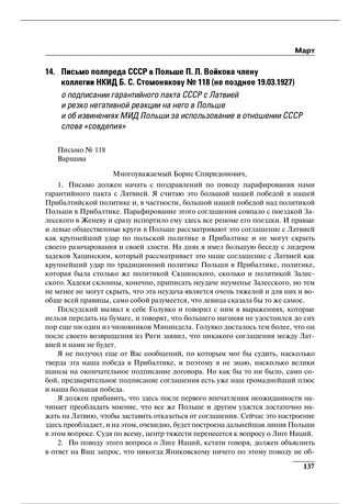 Письмо полпреда СССР в Польше П.Л. Войкова члену коллегии НКИД Б.С. Стомонякову № 118 (не позднее 19.03.1927) о подписании гарантийного пакта СССР с Латвией и резко негативной реакции на него в Польше и об извинениях МИД Польши за использование в отношении СССР слова «совдепия»