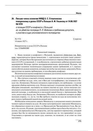 Письмо члена коллегии НКИД Б.С. Стомонякова поверенному в делах СССР в Польше А.Ф. Ульянову от 14.06.1927 № 5731 о позиции СССР в конфликте с Польшей из-за убийства полпреда П.Л. Войкова и требовании допустить к участию в суде уполномоченного полп...
