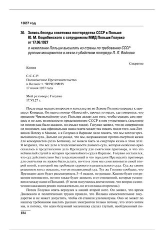 Запись беседы советника постпредства СССР в Польше Ю.М. Коцюбинского с сотрудником МИД Польши Голувко от 17.06.1927 о нежелании Польши высылать из страны по требованию СССР русских монархистов в связи с убийством полпреда П.Л. Войкова // АВП. Ф. 04. Оп. 32. П. 220. Д. 52716. Л. 11–13; Документы и материалы по истории советско-польских отношений. Т. V. М., 1967. C. 168–170.