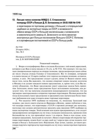 Письмо члена коллегии НКИД Б.С. Стомонякова полпреду СССР в Польше Д.В. Богомолову от 20.03.1928 № 5745 о переговорах по торговому договору с Польшей; о стопроцентной надбавке на экспортные товары из СССР; о возможности обмена между СССР и Польшей...