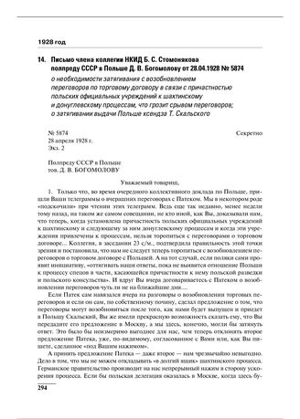 Письмо члена коллегии НКИД Б.С. Стомонякова полпреду СССР в Польше Д.В. Богомолову от 28.04.1928 № 5874 о необходимости затягивания с возобновлением переговоров по торговому договору в связи с причастностью польских официальных учреждений к шахтин...