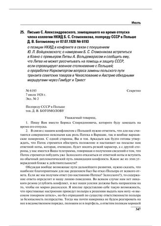 Письмо С. Александровского, замещавшего на время отпуска члена коллегии НКИД Б. С. Стомонякова, полпреду СССР в Польше Д.В. Богомолову от 07.07.1928 № 6193 о позиции НКИД в конфликте в связи с покушением Ю.Л. Войцеховского; о намерении Б.С. Стомон...