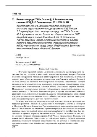 Письмо полпреда СССР в Польше Д.В. Богомолова члену коллегии НКИД Б.С. Стомонякову от 05.11.1928 № 112 о вероятности войны с Польшей; о попытках начальника восточного отдела политического департамента МИД Польши Т. Голувко убедить 1-го секретаря постпредства СССР в Польше М.П. Аркадьева в том, что Польша не собирается воевать с СССР по крайней мере в течение ближайших 2 лет; об организации УВО при поддержке немцев антипольских выступлений в Львове и Праге; о параллельных конгрессах «Революционной фракции» и ППС; о противоречиях между главой МИД Польши А. Залесским и посланником Польши в Москве С. Патеком // АВП. Ф. 04. Оп. 32. П. 221. Д. 52743. Л. 188–198.