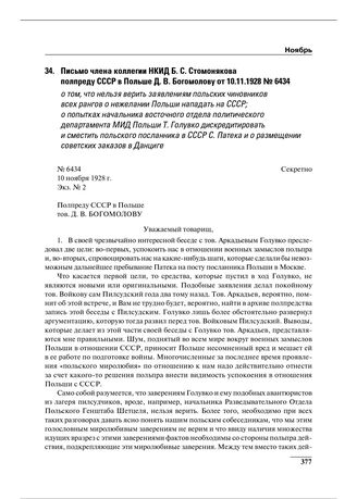 Письмо члена коллегии НКИД Б.С. Стомонякова полпреду СССР в Польше Д.В. Богомолову от 10.11.1928 № 6434 о том, что нельзя верить заявлениям польских чиновников всех рангов о нежелании Польши нападать на СССР; о попытках начальника восточного отдела политического департамента МИД Польши Т. Голувко дискредитировать и сместить польского посланника в СССР С. Патека и о размещении советских заказов в Данциге
