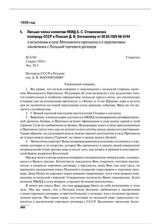 Письмо члена коллегии НКИД Б.С. Стомонякова полпреду СССР в Польше Д.В. Богомолову от 02.03.1929 № 6744 о вступлении в силу Московского протокола и о перспективах заключения с Польшей торгового договора