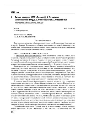 Письмо полпреда СССР в Польше Д.В. Богомолова члену коллегии НКИД Б.С. Стомонякову от 27.03.1929 № 109 об иностранной политике Польши // АВП. Ф. 04. Оп. 32. П. 222. Д. 52777. Л. 86–106.