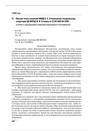 Письмо члена коллегии НКИД Б.С. Стомонякова генеральному секретарю ЦК ВКП(б) И.В. Сталину от 27.04.1930 № 5788 в связи с неудавшимся взрывом варшавского полпредства