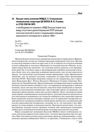 Письмо члена коллегии НКИД Б.С. Стомонякова генеральному секретарю ЦК ВКП(б) И.В. Сталину от 27.05.1930 № 5875 о необходимости направить МИД Польши новую ноту ввиду отсутствия удовлетворившей СССР реакции польских властей в связи с неудавшимся взрывом варшавского полпредства в апреле 1930 г.