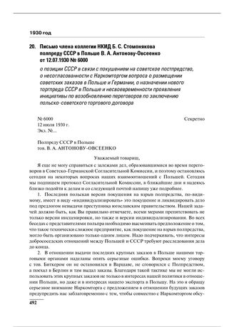 Письмо члена коллегии НКИД Б.С. Стомонякова полпреду СССР в Польше В.А. Антонову-Овсеенко от 12.07.1930 № 6000 о позиции СССР в связи с покушением на советское постпредство, о несогласованности с Наркомторгом вопроса о размещении советских заказов в Польше и Германии, о назначении нового торгпреда СССР в Польше и несвоевременности проявления инициативы по возобновлению переговоров по заключению польско-советского торгового договора