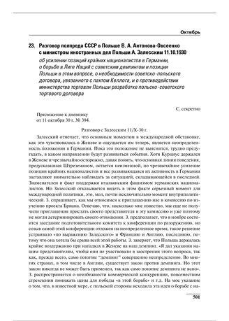 Разговор полпреда СССР в Польше В.А. Антонова-Овсеенко с министром иностранных дел Польши А. Залесским 11.10.1930 об усилении позиций крайних националистов в Германии, о борьбе в Лиге Наций с советским демпингом и позиции Польши в этом вопросе, о необходимости советско-польского договора, увязанного с пактом Келлога, и о противодействии министерства торговли Польши разработке польско-советского торгового договора // АВП РФ. Ф. 05. Оп. 10. П. 68. Д. 116. Л. 20–22; Документы внешней политики СССР. Т. XIII. М., 1964. С. 558–560.