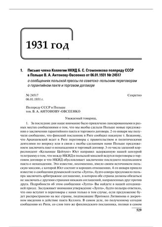 Письмо члена Коллегии НКИД Б.С. Стомонякова полпреду СССР в Польше В.А. Антонову-Овсеенко от 06.01.1931 № 24517 о сообщениях польской прессы по советско-польским переговорам о гарантийном пакте и торговом договоре // АВП. Ф. 010. Оп. 4. П. 21. Д. 63. Л. 460–461.