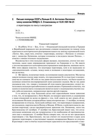 Письмо полпреда СССР в Польше В.А. Антонова-Овсеенко члену коллегии НКИД Б.С. Стомонякову от 13.01.1931 № 21 о переговорах по пакту о неагрессии
