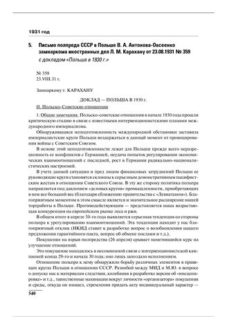 Письмо полпреда СССР в Польше В.А. Антонова-Овсеенко замнаркома иностранных дел Л. М. Карахану от 23.08.1931 № 359 с докладом «Польша в 1930 г.»