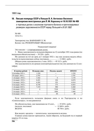 Письмо полпреда СССР в Польше В.А. Антонова-Овсеенко замнаркома иностранных дел Л.М. Карахану от 10.10.1931 № 409 о торговых делах с анализом торгового баланса и прогнозируемых размерах задолженности СССР перед Польшей к 01.01.1932 г. // АВП РФ. Ф. 05. Оп. 11. П. 78. Д. 83. Л. 87–89.