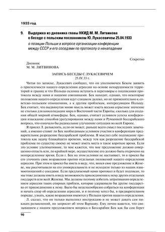 Выдержка из дневника главы НКИД М.М. Литвинова о беседе с польским посланником Ю. Лукасевичем 25.04.1933 о позиции Польши в вопросе организации конференции между СССР и его соседями по протоколу о ненападении // АВП. Ф. 09. Оп. 8. П. 61. Д. 1. Л. 15–17.
