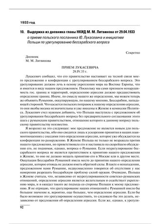 Выдержка из дневника главы НКИД М.М. Литвинова от 29.04.1933 о приеме польского посланника Ю. Лукасевича и инициативе Польши по урегулированию бессарабского вопроса