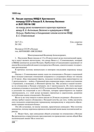 Письмо замглавы НКИД Н. Крестинского полпреду СССР в Польше В.А. Антонову-Овсеенко от 26.07.1933 № 1382 по поводу резко полемического характера переписки между В.А. Антоновым-Овсеенко и курирующим в НКИД Польшу, Прибалтику и Скандинавию членом коллегии НКИД Б.С. Стомоняковым