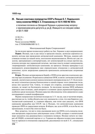 Письмо советника полпредства СССР в Польше Б.Г. Подольского члену коллегии НКИД Б.С. Стомонякову от 12.11.1933 № 437/с о политике поляков на Западной Украине и украинскому вопросу с приложением речи депутата д-ра Д. Левицкого на пленуме сейма от 03.11.1933 г.