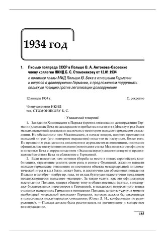 Письмо полпреда СССР в Польше В.А. Антонова-Овсеенко члену коллегии НКИД Б.С. Стомонякову от 12.01.1934 о политике главы МИД Польши Ю. Бека в отношении Германии и вопросе о довооружении Германии, с предложением поддержать польскую позицию против легализации довооружения // АВП. Ф. 09. Оп. 9. П. 77. Д. 113. Л. 23–27.