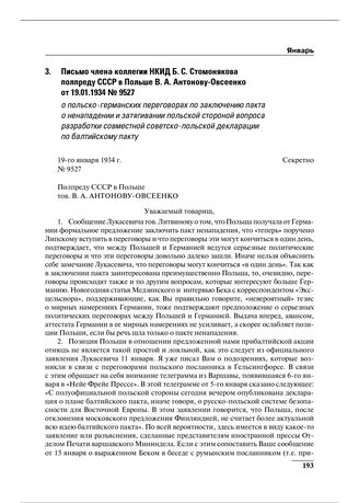 Письмо члена коллегии НКИД Б.С. Стомонякова полпреду СССР в Польше В.А. Антонову-Овсеенко от 19.01.1934 № 9527 о польско-германских переговорах по заключению пакта о ненападении и затягивании польской стороной вопроса разработки совместной советск...