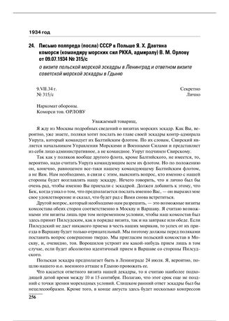 Письмо полпреда (посла) СССР в Польше Я.Х. Давтяна коморси (командиру морских сил РККА, адмиралу) В.М. Орлову от 09.07.1934 № 315/с о визите польской морской эскадры в Ленинград и ответном визите советской морской эскадры в Гдыню