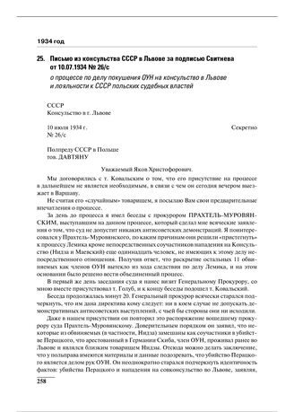 Письмо из консульства СССР в Львове за подписью Свитнева от 10.07.1934 № 26/с о процессе по делу покушения ОУН на консульство в Львове и лояльности к СССР польских судебных властей