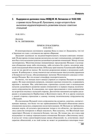Выдержки из дневника главы НКИД М.М. Литвинова от 10.02.1935 о приеме посла Польши Ю. Лукасевича, в ходе которого была высказана неудовлетворенность развитием польско-советских отношений // АВП. Ф. 09. Оп. 21. П. 84. Д. 114. Л. 1–7. ДВП СССР. Т. XVIII. М., 1973. С. 78–83. Документы и материалы по истории советско-польских отношений. Т. VI. М., 1969. С. 252–255.