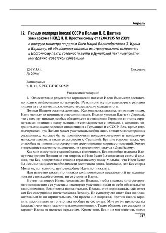 Письмо полпреда (посла) СССР в Польше Я.Х. Давтяна замнаркома НКИД Н.Н. Крестинскому от 12.04.1935 № 209/с о поездке министра по делам Лиги Наций Великобритании Э. Идена в Варшаву, об объяснениях поляков их отрицательного отношения к Восточному па...