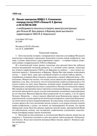 Письмо замнаркома НКИД Б.С. Стомонякова полпреду (послу) СССР в Польше Я.Х. Давтяну от 04.10.1935 № 2549 о необходимости попытаться уговорить министра иностранных дел Польши Ю. Бека вернуть в Варшаву ранее высланного корреспондента ТАСС И.А. Ковальского // АВП. Ф. 09. Оп. 21. П. 84. Д. 110. Л. 32–33.