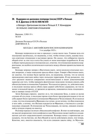 Выдержка из дневника полпреда (посла) СССР в Польше Я.Х. Давтяна от 03.12.1935 № 619 о беседе с британским послом в Польше Х.У. Кеннардом по польско-советским отношениям