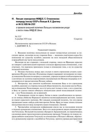 Письмо замнаркома НКИД Б.С. Стомонякова полпреду (послу) СССР в Польше Я.Х. Давтяну от 04.12.1935 № 2727 о провале внешней политики Польши и возможном уходе с поста главы МИД Ю. Бека