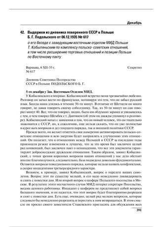 Выдержки из дневника поверенного СССР в Польше Б.Г. Подольского от 06.12.1935 № 617 о его беседе с заведующим восточным отделом МИД Польши Т. Кобыляньским по комплексу польско-советских отношений, в том числе расширению торговых отношений и позиции Польши по Восточному пакту