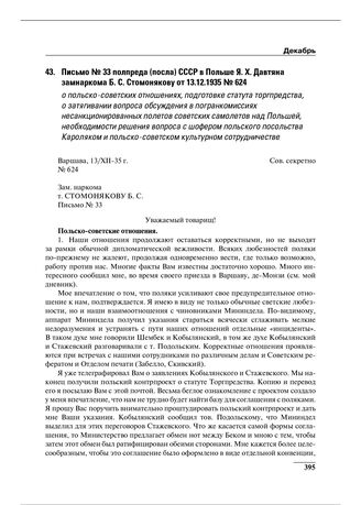 Письмо № 33 полпреда (посла) СССР в Польше Я.Х. Давтяна замнаркома Б.С. Стомонякову от 13.12.1935 № 624 о польско-советских отношениях, подготовке статута торгпредства, о затягивании вопроса обсуждения в погранкомиссиях несанкционированных полетов советских самолетов над Польшей, необходимости решения вопроса с шофером польского посольства Кароляком и польско-советском культурном сотрудничестве