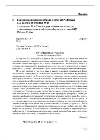 Выдержка из дневника полпреда (посла) СССР в Польше Я.Х. Давтяна от 01.02.1936 № 61 о прошедших 29 и 31 января двух приемах в полпредстве с участием представителей польской культуры и главы МИД Польши Ю. Бека // АВП. Ф. 09. Оп. 24. П. 93. Д. 20. Л. 19.