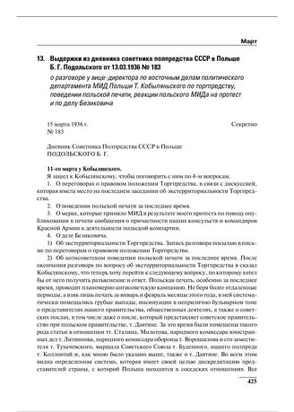 Выдержки из дневника советника полпредства СССР в Польше Б.Г. Подольского от 13.03.1936 № 183 о разговоре у вице-директора по восточным делам политического департамента МИД Польши Т. Кобыляньского по торгпредству, поведении польской печати, реакции польского МИДа на протест и по делу Безиковича // АВП. Ф. 09. Оп. 24. П. 93. Д. 20. Л. 14–19.