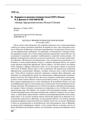Выдержка из дневника полпреда (посла) СССР в Польше Я.Х. Давтяна от 14.03.1936 № 205 о беседе с французским послом в Польше Л. Ноэлем