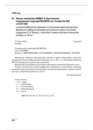 Письмо замнаркома НКИД Н.Н. Крестинского генеральному секретарю ЦК ВКП(б) тов. Сталину № 4529 от 27.07.1936 о нецелесообразности приводить в исполнение смертный приговор Верховного трибунала Белорусского военного округа польскому гражданину Е.В. Янушко, с просьбой о замене расстрела лишением свободы на 10 лет // АВП. Ф. 010. Оп. 11. П. 74. Д. 81. Л. 79.