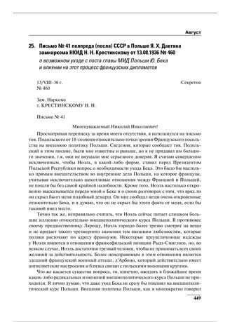 Письмо № 41 полпреда (посла) СССР в Польше Я.Х. Давтяна замнаркома НКИД Н.Н. Крестинскому от 13.08.1936 № 460 о возможном уходе с поста главы МИД Польши Ю. Бека и влиянии на этот процесс французских дипломатов