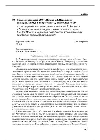 Письмо поверенного СССР в Польше Б.Г. Подольского замнаркома НКИД Н.Н. Крестинскому от 24.11.1936 № 614 о приезде румынского министра иностранных дел В. Антонеску в Польшу, польско-чешских делах, визите германского посла Г.А. фон Мольтке к маршалу...