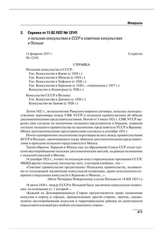 Справка от 11.02.1937 № 12141 о польских консульствах в СССР и советских консульствах в Польше // АВП. Ф. 05. Оп. 17. П. 133. Д. 81. Л. 202–204.